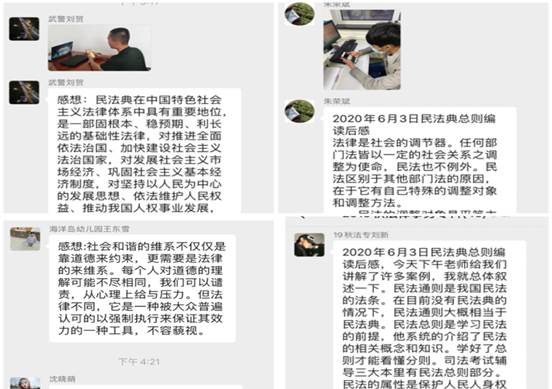 《中华人民共和国民法典》已由中华人民共和国第十三届全国人民代表大会第三次会议于2020年5月28日通过,自2021年1月1日起施行。国家开放大学自2020年6月3日始开展了《民法典》知识的系列讲座。长海分校积极组织学生观看,学习过程中引起广大师生强烈响应。《中华人民共和国民法典》被称为“社会生活百科全书”,是民事权利的宣言书和保障书,几乎所有的民事活动大都能在民法典中找到,切实关系着每一个人学习生活的各个方面。学员们无论是在工作岗位,还是在家休息,利用手机、PC机、iPad等进行了认真的观看学习并进行热烈的讨论。